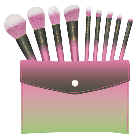 Degrade renk kolu özel etiket kendi yapmak 9 adet pembe makyaj fırçası seti yumuşak yüksek kalite özel makyaj fırçalar